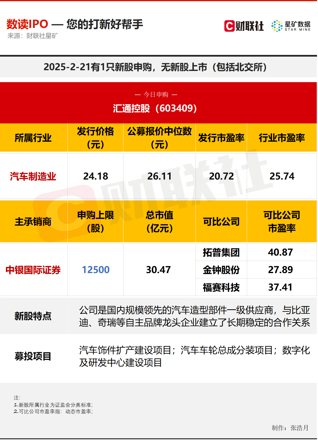 财联社2月21日讯,今日有1只新股申购,为沪市主板的汇通控股;无新股上市。