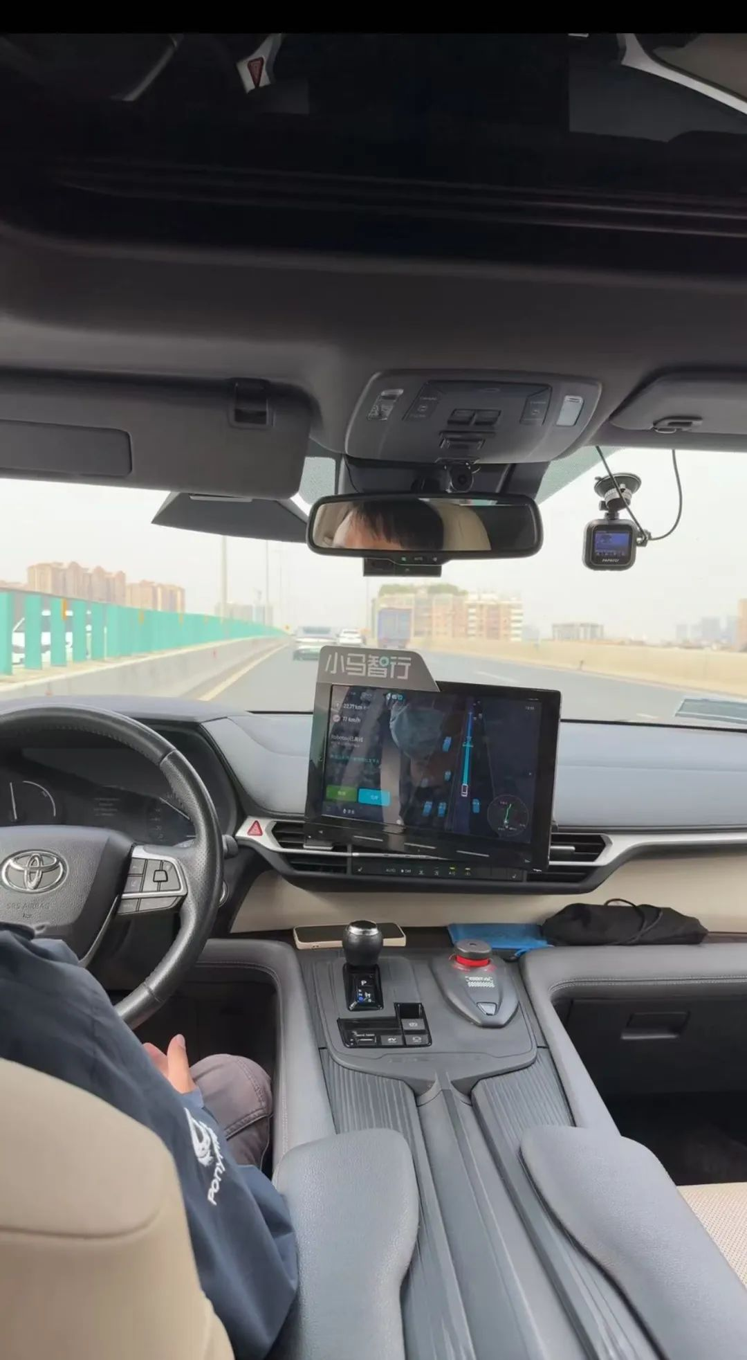 此次来接送我们的是一台七座的MPV。坐进车内,只见前排座椅中央,一块电子屏,正实时显示着车辆的工作状态,如实时路线等。乘客按规定需坐在第二、三排座位,但车内整洁宽敞,座椅舒适。在第二排座椅前方左右两侧,还分别各有一块屏幕,能为乘客提供音乐、视频等娱乐功能;该屏幕也可以调节车内空调,或查看车辆自动驾驶动态情况,如避让周边车辆、行人、等待红绿灯等可一目了然。