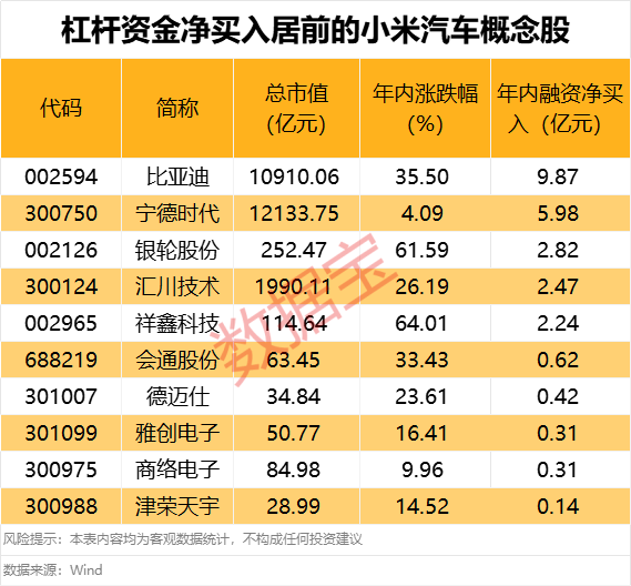从资金面来看,年内5只小米汽车概念股获得杠杆资金大手笔净买入,净买入金额均超2亿元,分别是比亚迪、宁德时代、银轮股份、汇川技术、祥鑫科技。