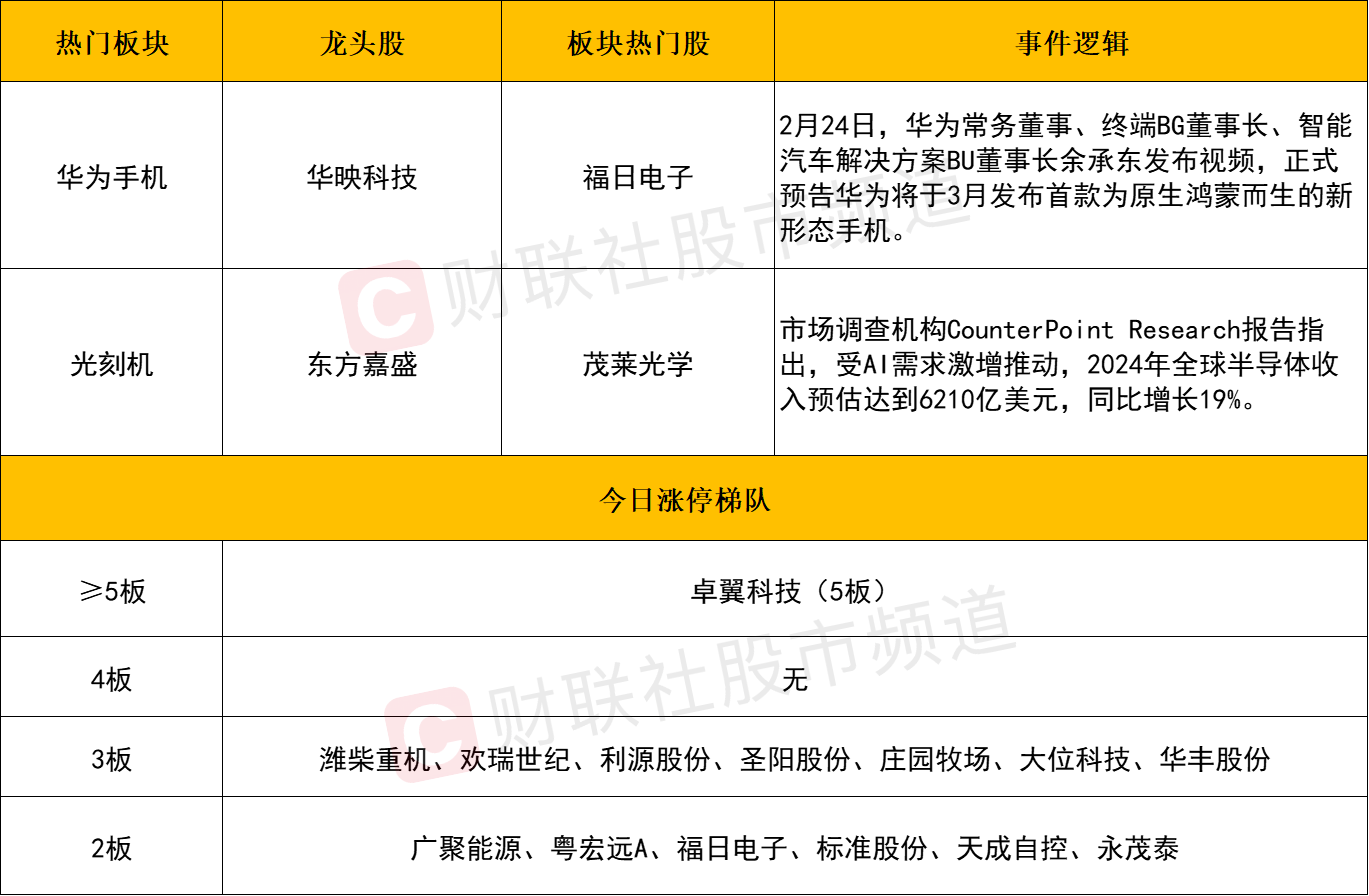 板块上,消费电子方向逆势活跃,其中华为手机概念股涨幅居前,大富科技、福日电子、华映科技、科森科技等个股涨停,博众精工、银邦股份、冠石科技涨幅居前。消息面上,2月24日,华为常务董事、终端BG董事长、智能汽车解决方案BU董事长余承东发布视频,正式预告华为将于3月发布首款为原生鸿蒙而生的新形态手机。