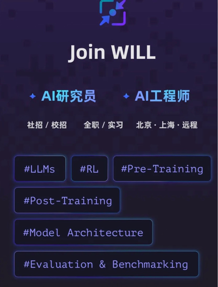 根据招聘显示,WILL实验室重点招募方向聚焦在具备扎实AI技术功底又怀有科研理想的研究员和工程师,并称希望“共同参与这场需要长期投入的智能科研征程”。