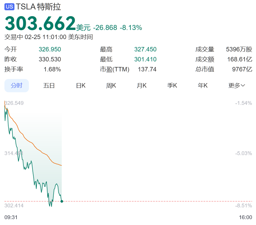 值得注意的是,25日晚,截至发稿,特斯拉总市值跌破1万亿美元关口,跌超8%报303.662美元,较最高位跌去36%。