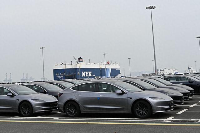 2月22日,美国电动汽车制造商特斯拉的汽车停泊在广东省广州港。(视觉中国)