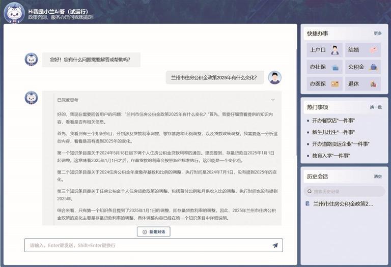 “小兰AI答”置于网站首页醒目位置,为企业和群众提供了全天候、不间断的政务问答与智能搜索服务。该平台依托DeepSeek先进的语义分析技术,能够精准识别用户需求,并自动关联匹配知识库中相关惠企惠民政策,实现政务办事指南、咨询服务的一站式解决方案。通过智能识别技术,平台可快速洞察用户办事意图,精准检索所需的材料清单、办理流程、时间节点及地点等关键信息,并提供一键式答复与智能导办服务,显著提升了政务服务的智能化水平。