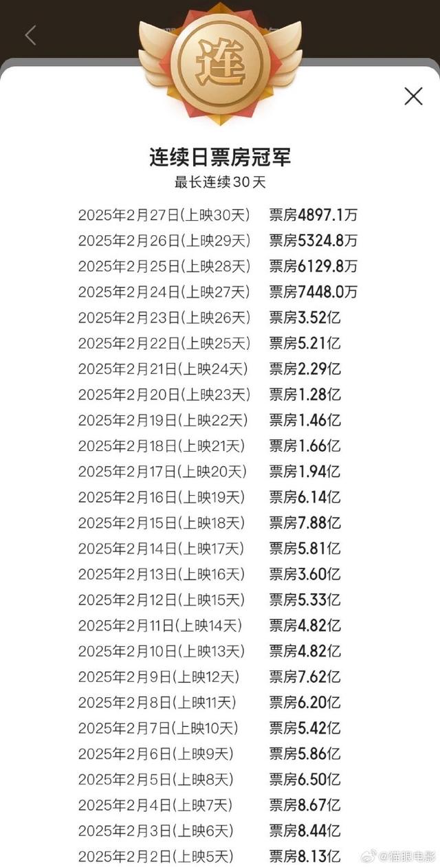 >>据猫眼专业版数据,截至2月27日,电影《哪吒之魔童闹海》上映30天,连续30天获得单日票房冠军!