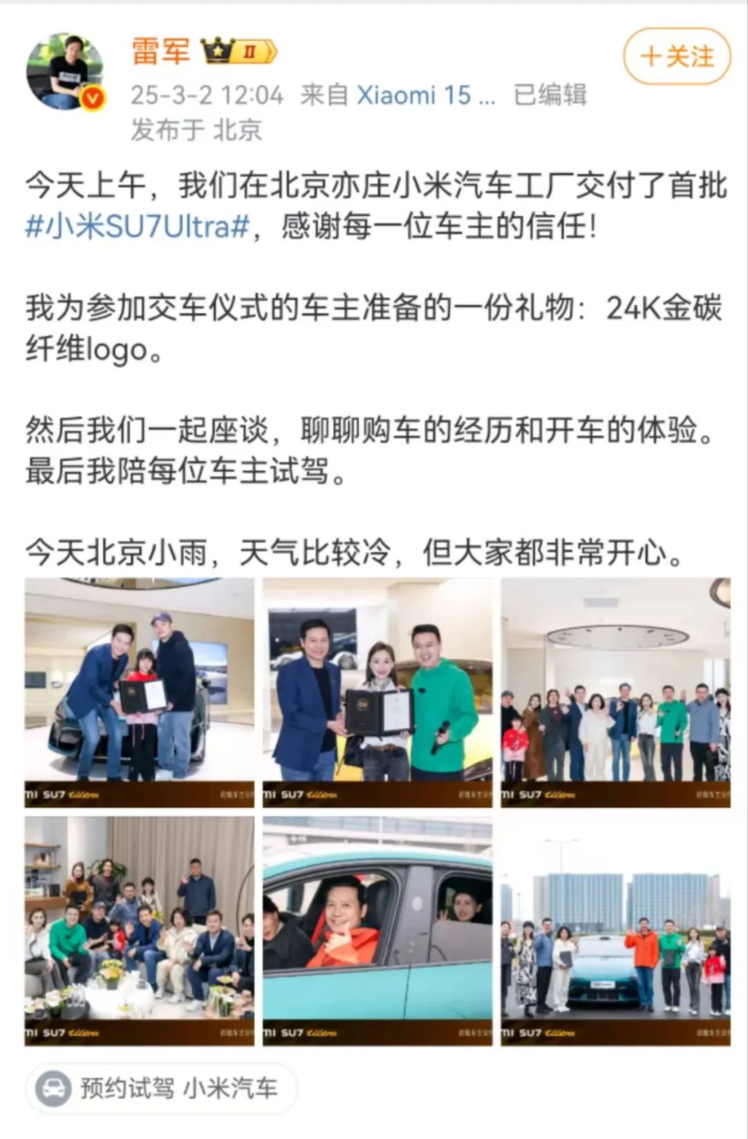 今天中午,雷军发文称:今天上午,我们在北京亦庄小米汽车工厂交付了首批小米SU7 Ultra,感谢每一位车主的信任!我为参加交车仪式的车主准备的一份礼物:24K金碳纤维logo。然后我们一起座谈,最后我陪每位车主试驾。今天北京小雨,天气比较冷,但大家都非常开心。