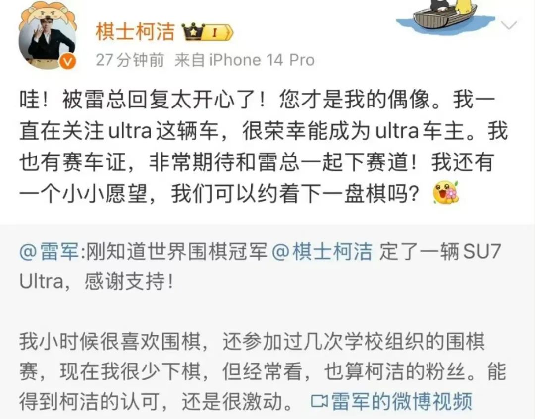 此前,雷军在微博发文称:刚知道世界围棋冠军柯洁定了一辆SU7 Ultra,感谢支持!