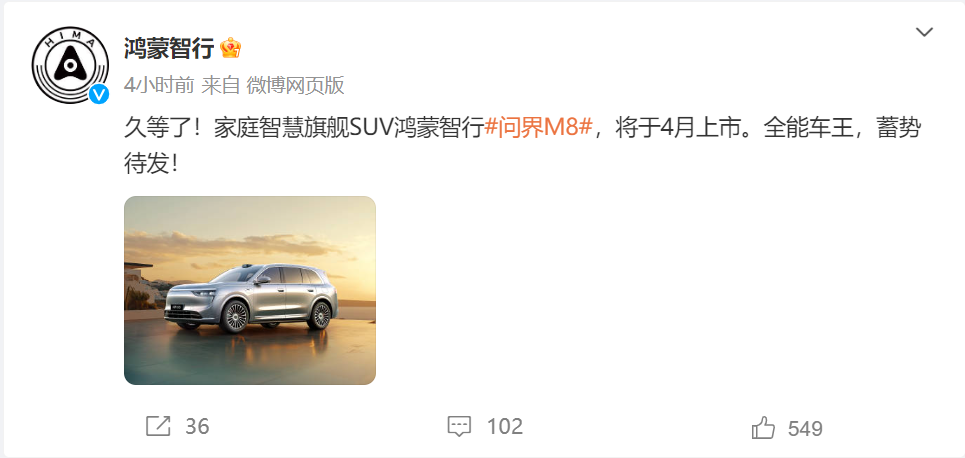 3月5日,鸿蒙智行正式宣布问界M8将于4月上市。