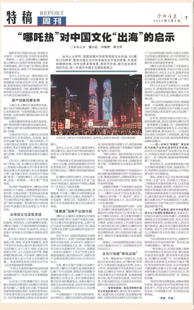 《哪吒之魔童闹海》(《哪吒2》)在海外产生广泛影响,票房屡创新高。由国家电影局和中央广播电视总台联合主办的“跟着电影游中国”活动在全球各地举办了超100场宣推活动,在海外引发热烈反响。3月6日出版的《参考消息》整版刊发了《“哪吒热”对中国文化“出海”的启示》,全文如下: