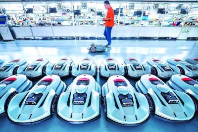 2024年10月23日,浙江白马科技有限公司车间里,工作人员测试智能割草机器人。新华社发