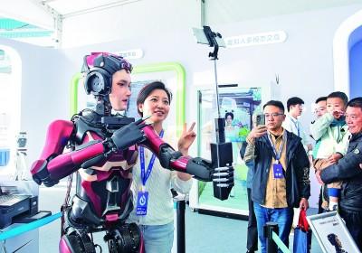 2024年10月24日,第七届世界声博会上,人形交互机器人与观众合影。新华社发