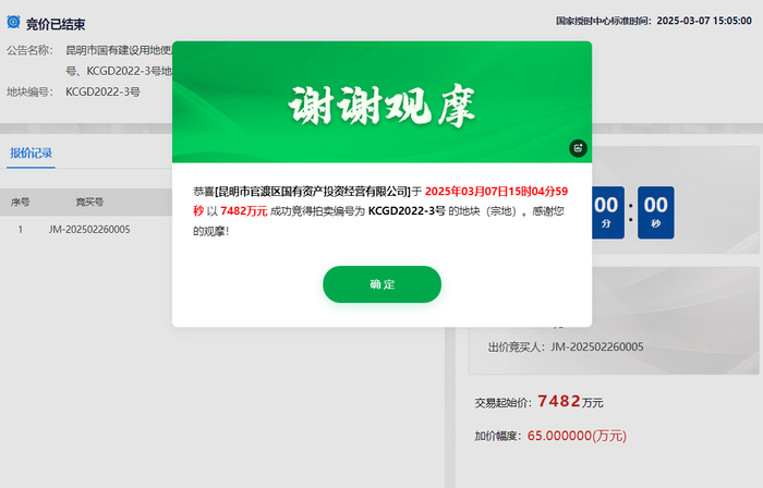 其中,昆明市官渡区关上街道编号为KCGD2021-4 号、KCGD2024-37 号地块,共计45.85亩的二类城镇住宅用地,被昆明巫家坝建设发展有限责任公司底价拿下,成交楼面价分别为714元/㎡、667元/㎡。