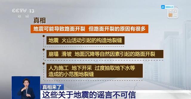 真相:地震可能导致路面开裂,但开裂的原因有很多:包括地震、火山活动引起的构造地裂缝;崩塌、滑坡、地面沉降等自然因素引起的路面开裂;以及人为施工、地下开采、过度抽取地下水等造成的小范围地裂缝。