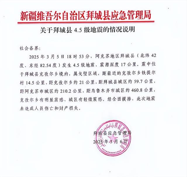 3月6日,拜城县应急管理局发布辟谣声明:经全面摸排,此次地震未造成人员伤亡和财产损失。