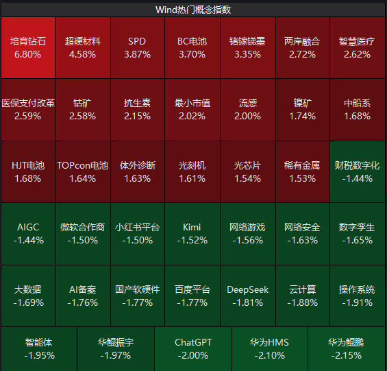 盘面上,市场热点较为杂乱,个股涨多跌少,全市场超3200只个股上涨。从板块来看,AI医疗概念股逆势大涨,润达医疗等涨停。光伏概念股震荡反弹,海优新材涨停。机器人概念股局部活跃,京城股份等多股涨停。下跌方面,算力、国资云概念股展开调整,海南华铁跌停。板块方面,AI医疗、复合集流体、电机、光伏设备等板块涨幅居前,国资云、保险、华为昇腾、AI智能体等板块跌幅居前。