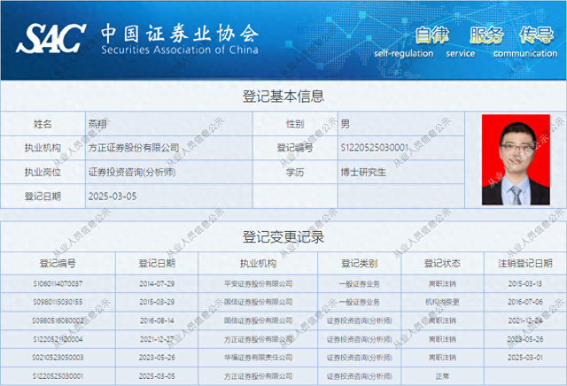 中国证券业协会(下称“中证协”)官网资料显示,3月1日,燕翔在华福证券的执业登记状态已变更为离职注销。3月5日,燕翔的执业机构已登记为方正证券,登记类别为证券投资咨询(分析师),登记状态为正常。