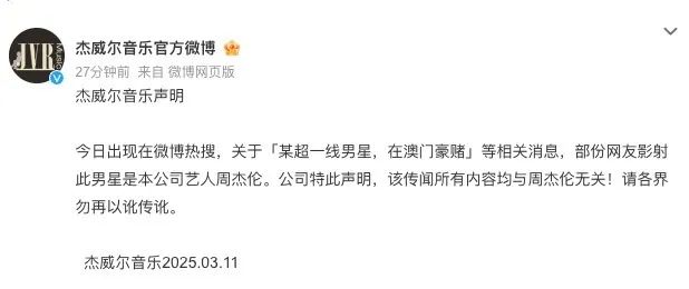 11日,周杰伦公司杰威尔音乐官方微博发布声明回应“周杰伦澳门”传闻。声明称:“关于‘某超一线男星,在澳门豪赌’等相关消息,部份网友影射此男星是本公司艺人周杰伦。公司特此声明,该传闻所有内容均与周杰伦无关!”