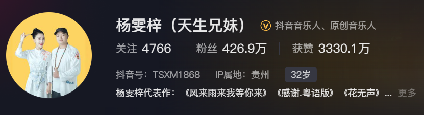 公开资料显示,杨雯梓(原名:杨前菲),女,出生于松桃苗族自治县冷水溪镇红星村,毕业于北京现代音乐学院,“天生兄妹”组合成员,曾获多彩贵州形象大使之誉称,央视三台《黄金100秒》金牌获得者;代表作:《贵州我深爱的家乡》、《百分百好男人》、《请你来贵阳》等。