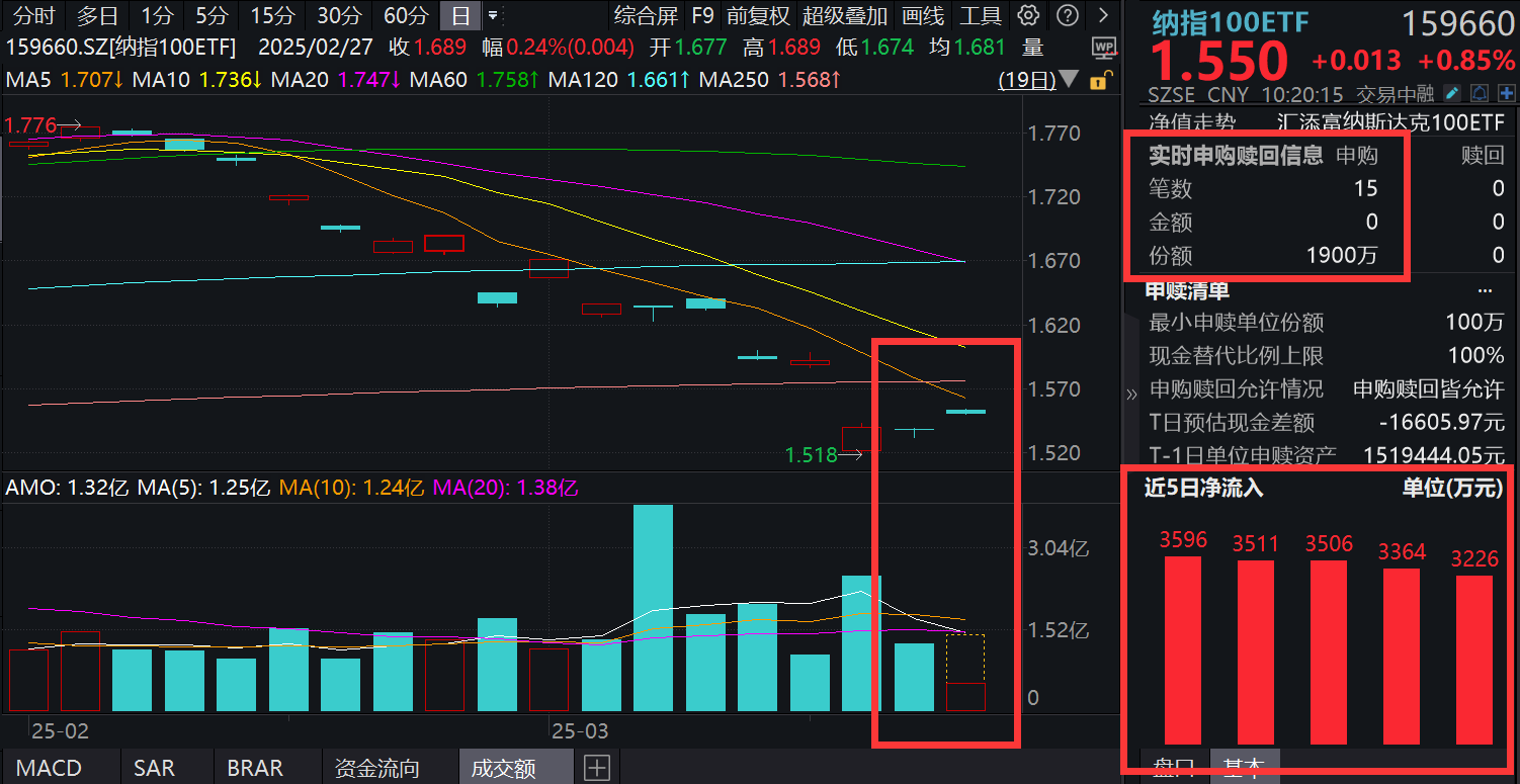 当地时间3月12日,美国三大股指收盘涨跌不一,道指跌0.2%;纳指100涨超1%;标普500指数涨0.49%。3月13日,纳指100ETF(159660)高开震荡,当前涨0.85%,成交额6000元,交投环比放量!资金继续汹涌增仓,纳指100ETF(159660)开盘即获近3000万元净申购,截至今日纳指100ETF(159660)已经连续10日获得资金大举增仓。