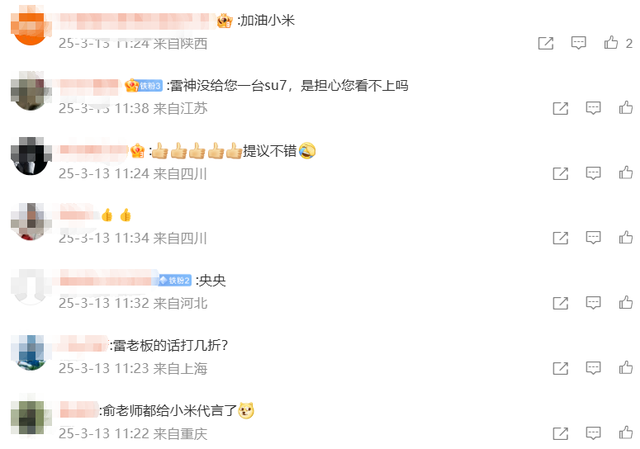 在评论区,有网友留言表示:“俞老师都给小米代言了”“雷神没给您一台su7,是担心您看不上吗”。