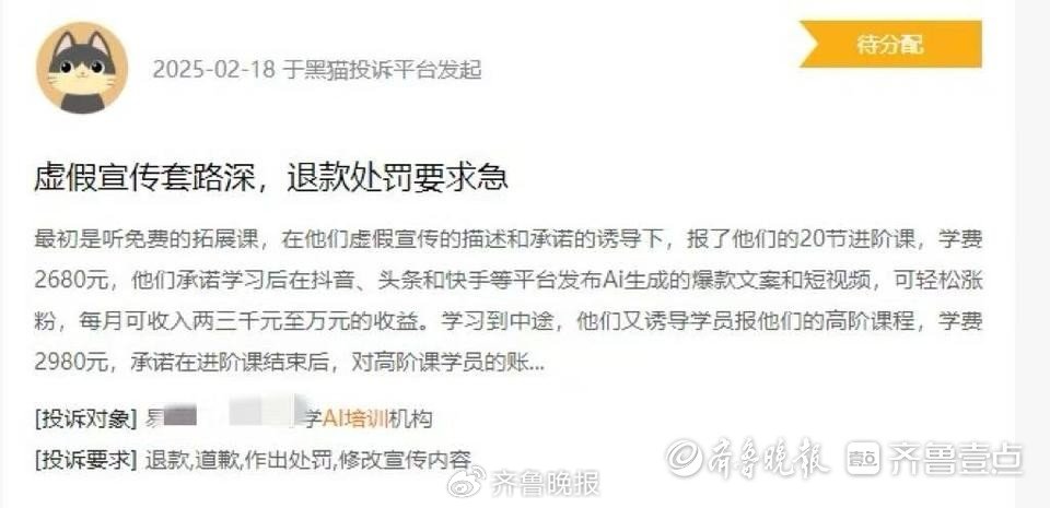 陆女士的遭遇并非个例。齐鲁晚报·齐鲁壹点记者搜索发现,很多网友都在社交平台发声,表示自己也掉入AI培训课程的陷阱,维权之路艰难。截至3月13日,在黑猫投诉 【下载黑猫投诉客户端】平台,与“AI培训”相关的投诉超600条。