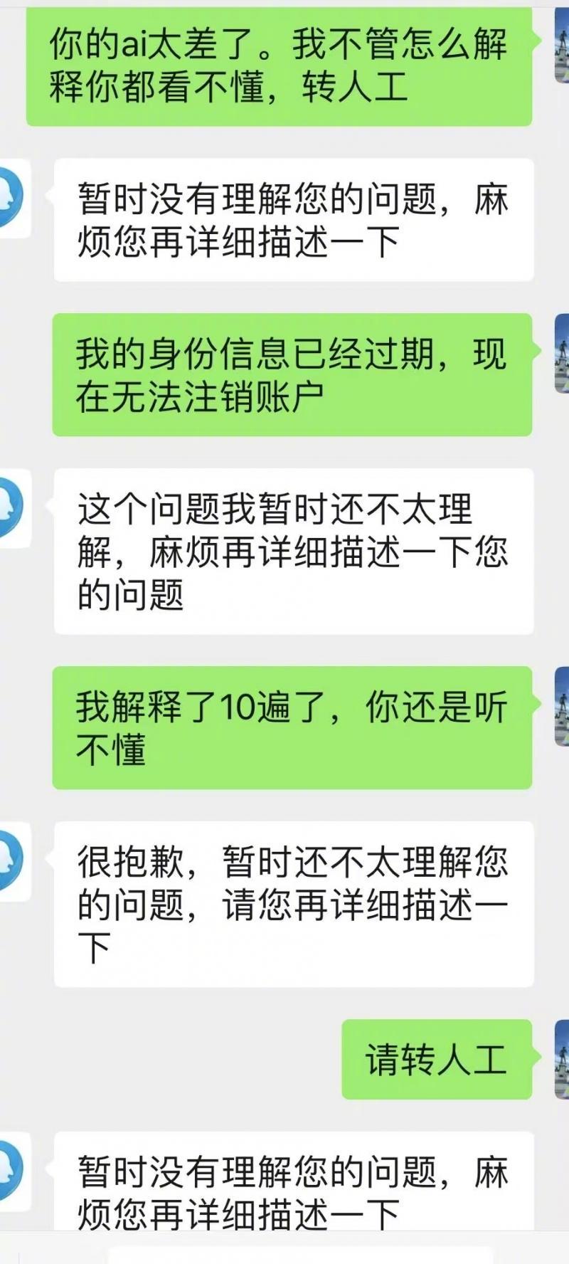 在与AI客服来回“交锋”了30余次,其间更是一度情绪爆发爆了粗口,冷静下来后冯选择了放弃。“我就是想找个人指导一下,是不是哪儿设定得不对。但是他们的智能客服不仅智障还倔。”
