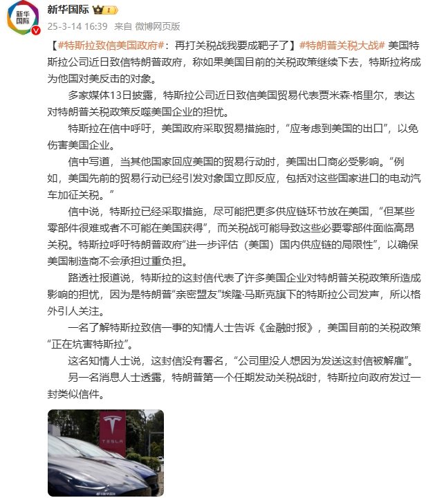 多家媒体13日披露,特斯拉公司近日致信美国贸易代表贾米森·格里尔,表达对特朗普关税政策反噬美国企业的担忧。