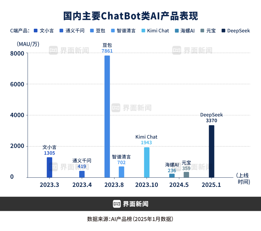 从2024年3月开始,Kimi Chat因为长文本标签爆火出圈,其身后的月之暗面以及创始人杨植麟成为焦点。5月,从“云雀”更名的豆包大模型正式发布,成为字节跳动加码AI的标志性节点。随即,因为Kimi和豆包均启动大力投放,双双成为用户感知更为强烈的AI产品。