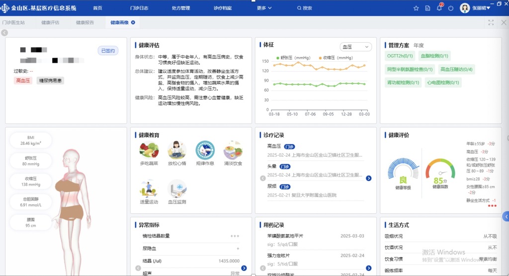 帮助医生辅助诊断之外,AI也正在为患者构建起一张动态、可视化、个性化的健康档案。记者注意到,在金山区卫镇社区卫生服务中心HIS系统中,全科医生只要点击“健康画像”即可显示辖区居民的健康信息,其中包含患者的基础疾病、过敏史、体征指标等。