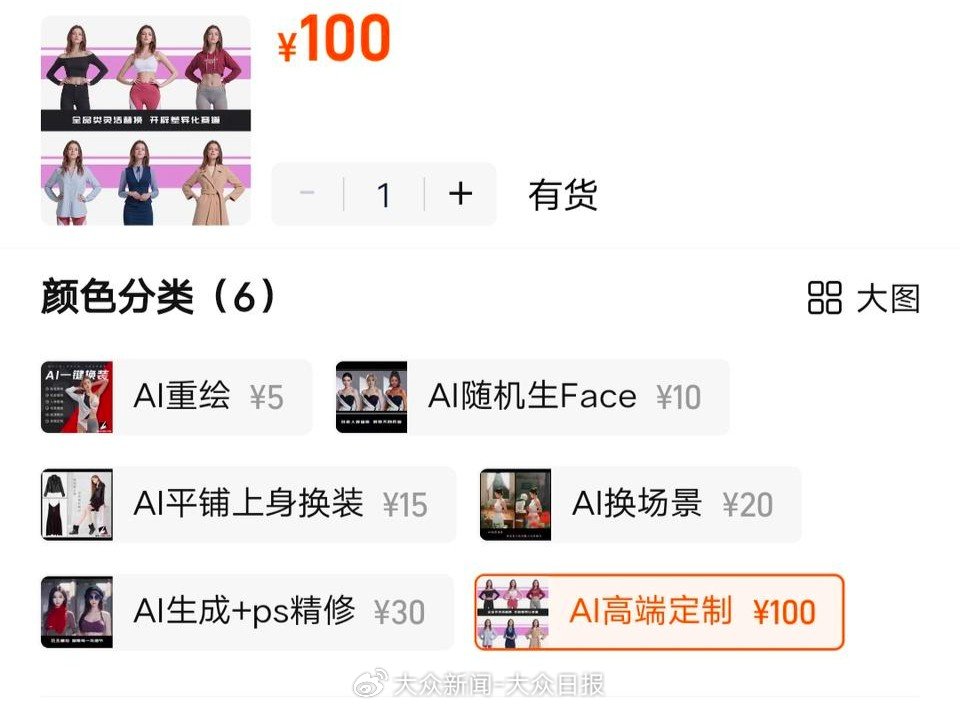 齐鲁晚报·齐鲁壹点记者还发现众多提供AI模特图制作服务的店铺,它们为商家提供AI重绘、随机生成Face、平铺上身换装、场景等服务,价格在5-20元区间,AI高端定制则在100-200元不等,且声称“不用担心模特侵权问题,可以进行洗脸”。