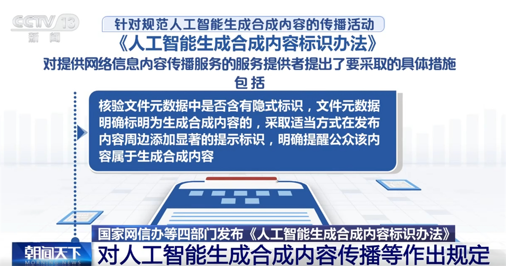 央视网消息:记者14日从国家网信办获悉,为了促进人工智能健康发展,规范人工智能生成合成内容标识,国家网信办、工业和信息化部、公安部、国家广播电视总局制定了《人工智能生成合成内容标识办法》。《标识办法》将于2025年9月1日起施行。