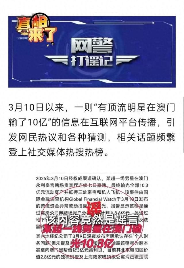 近日,一则“有顶流明星在澳门输了10亿”的消息在网络上广泛传播。相关话题频繁登上社交媒体热搜热榜。