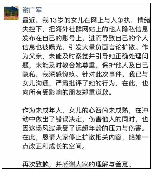 谢广军表示:“我13岁的女儿在网上与人争执,情绪失控下,把海外社群网站上的他人隐私信息发布在自己的账号上,进而导致自己的个人信息也被曝光,引发大量负面言论扩散。作为父亲,未能及时察觉并引导她正确处理问题,未能及时教会她尊重、保护他人及自己隐私,深感愧疚,向所有受影响的朋友郑重道歉。”