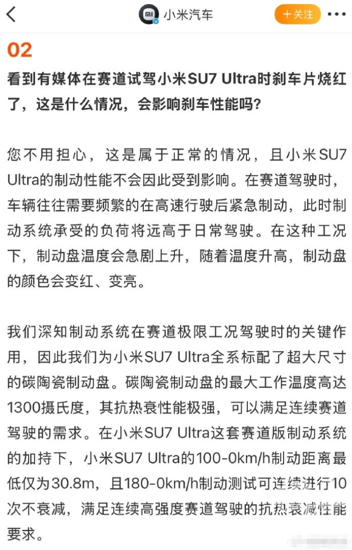 针对媒体在赛道试驾小米SU7 Ultra时刹车片“烧红”是否影响刹车性能问题,3月15日小米汽车官方发布了“答网友问”。