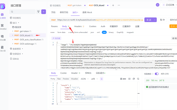 4.传入参数,这里传入图片的base64编码,发送后会返回识别到的信息