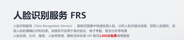 2.人脸识别服务FRS:人脸识别服务(Face Recognition Service),能够在图像中快速检测人脸、分析人脸关键点信息、获取人脸属性、实现人脸的精确比对和检索。该服务可应用于身份验证、电子考勤、客流分析等场景。