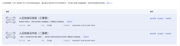 两个版本调用API接口使用服务的流程一样,这里以人证核身证件版(二要素)为例演示一遍,具体操作可参考用户指南。