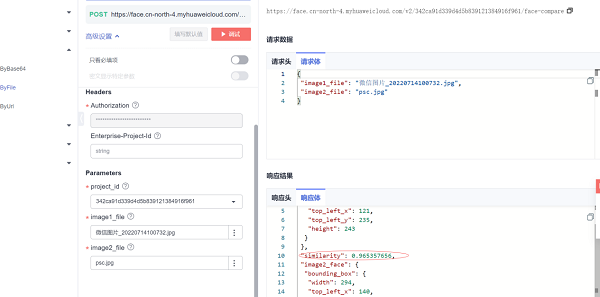 这里演示一遍调用人脸对比服务API,调用方法可参考用户指南。