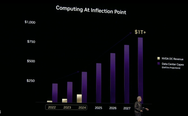 在此情况下,黄仁勋认为云厂商对GPU仍有较大需求。他表示,现在有了强化学习,业内有能力生成大量token,可以生成大量的合成数据去训练机器人,各种新变化给行业带来巨大的计算挑战,行业正在作出回应。例如大型云厂商正在采购GPU,“Blackwell开始出货的一年内,你能看到人工智能基础设施建设出现了难以置信的增长。”黄仁勋放出分析师对数据中心资本支出的预测,显示预期支出还将逐年增长,到2028年将增长至1万亿美元以上。