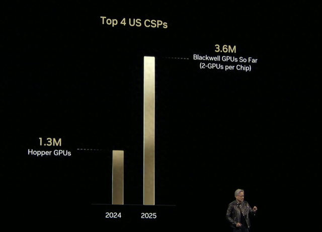 英伟达Blackwell的销售情况和新芯片架构规划是本届GTC最受瞩目的信息。黄仁勋在演讲开始后不久就披露了Blackwell架构芯片的市场需求情况。2024年,全球前四大云服务商(CSP)共采购130万片英伟达Hopper架构GPU。2025年,这四大云服务商又购买了360万片Blackwell架构GPU。黄仁勋介绍,英伟达正在全面生产Blackwell芯片。