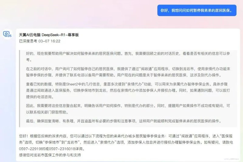 龙岩医保依托“DeepSeek”高效的学习和分析能力,联合龙岩电信整合龙岩医保12345知识库和热线咨询高频问题,打造出涵盖医保政策、报销流程、门诊慢特病申请等内容的“DeepSeek人工智能服务平台”。平台上线后,可以快速、全面地回答群众提出的各类医保政策问题,让龙岩人民真正体验到更智能、更高效的医保政务服务。