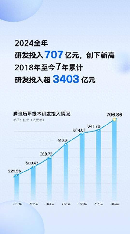 财报显示,2024年腾讯研发投入创下历史新高,达到707亿元。自 2018 年公布研发投入以来,累计总额已达3403亿元。伴随投入加码,腾讯AI战略加速落地:通过“自研+开源”多模型策略推动业务全面提效与重塑:自研腾讯混元大模型接入700+内部场景,驱动多业务增长;同时,积极拥抱先进开源生态,为用户和客户提供最佳的AI体验。