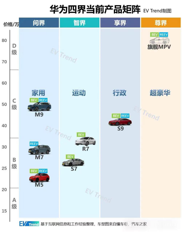 具体而言,问界的差异体现在:价格、车型、动力形式——智界只做纯电,问界做纯电+增程;问界M9在50万元以上市场逐渐站稳脚跟,问界品牌也要以此冲击高端市场。此外在车型方面,用余承东的话来说,问界聚焦在全系列SUV,“各种档次和各种定位的SUV问界都会做”。