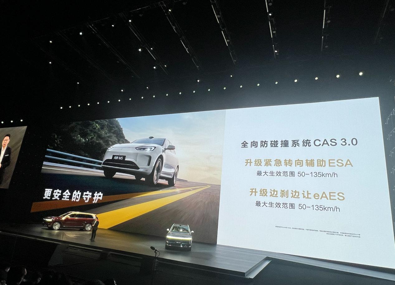 安全领域,问界新M5 Ultra配备全向防碰撞系统CAS 3.0,新增紧急转向辅助ESA与e-AES自动紧急转向,支持边刹边让,生效范围为50-135km/h。