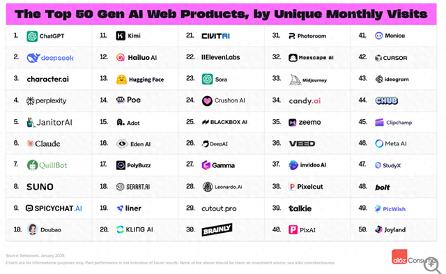 DeepSeek的技术革新与成本降低拉动行业“技术平权”,一方面冲击大模型原有格局,一方面拉动算力聚焦推理端,带动大模型应用的繁荣。全球投资机构a16z3月发布的AI产品流量TOP50榜单中,Web端排名前五十名里,中国共有19款产品入榜,占比升至38%。去年8月的榜单中,中国市场仅有8款产品上榜。同期美国AI产品的数量从33款降至23款,占比降至46%。