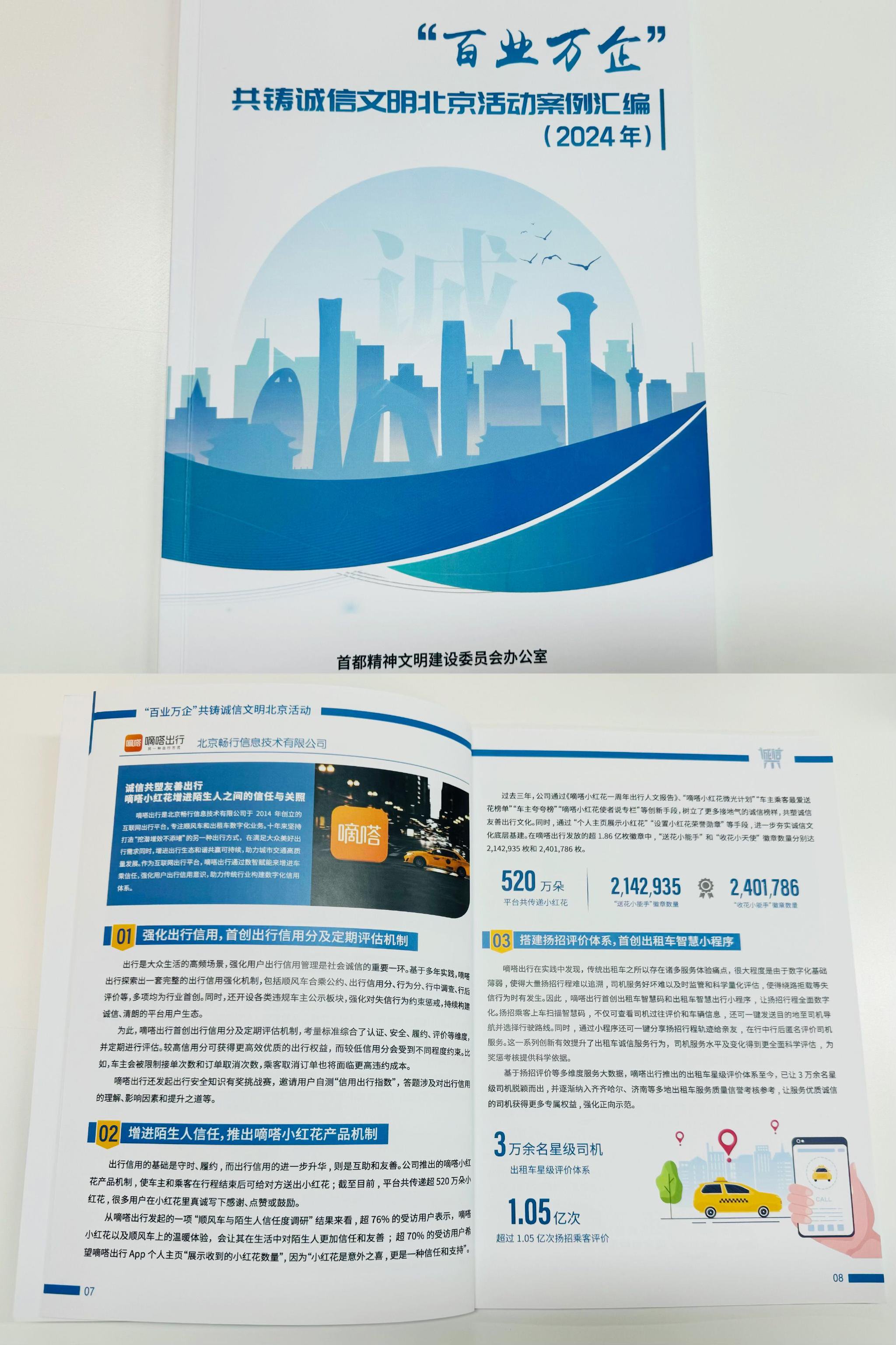 过去十年,嘀嗒出行始终将“让出行更温暖和愉悦”作为企业使命的重要一环,并深入践行。在近日由首都精神文明建设委员会办公室组织开展的“诚信典型案例”征集推荐活动中,嘀嗒出行从众多参评企业中脱颖而出,其顺风车和善文化建设成功入选2024“百业万企”共铸诚信文明北京活动案例汇编。