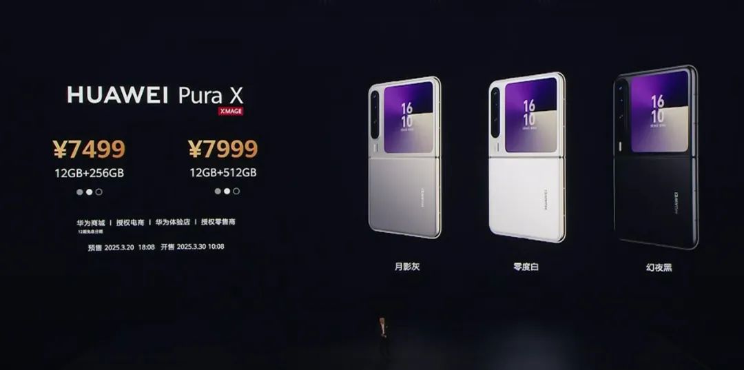 3月20日下午,华为Pura先锋盛典及鸿蒙智行新品发布会上,华为最新推出了新形态手机华为Pura X,普通版7499元起,典藏版8999元起。该机采用独特的16:10比例阔型屏设计,可显著提升用户在观影、创作和浏览等多种场景下的显示面积。