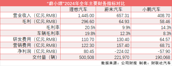 作为造车新势力中已连续九个季度盈利的理想汽车,2024年营收1445亿元,同比增长16.6%,连续两年营收突破千亿元,全年交付量达500,508辆,稳居造车新势力销量榜首。第四季度营收442.7亿元,季度交付量158,696辆,双双创下历史新高。截至2024年12月31日,理想汽车现金储备达到1128亿元,在三家车企中资金保障最为充沛。