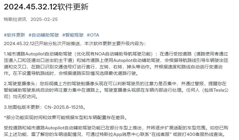 彼时,特斯拉已开始分批次为客户推送2024.45.32.12软件更新,最主要的升级就是“城市道路Autopilot自动辅助驾驶”(优化现有NOA自动辅助导航驾驶功能),包括在路口识别交通信号灯进行直行,左转,右转,掉头等动作。并根据速度和路线自动进行变道动作。在不设置导航路线时,会根据道路实际情况选择最优道路行驶。相关功能面向选配了FSD智能辅助驾驶功能且搭载HW4.0辅助驾驶硬件的部分车辆推送。