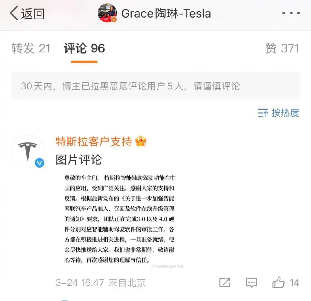 3月24日,“特斯拉客户支持”官方微博在特斯拉公司副总裁陶琳的微博评论区回应了“暂停FSD推送”的消息: